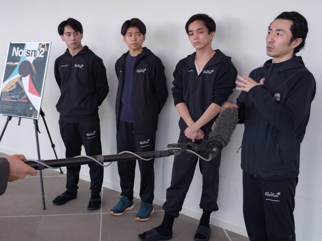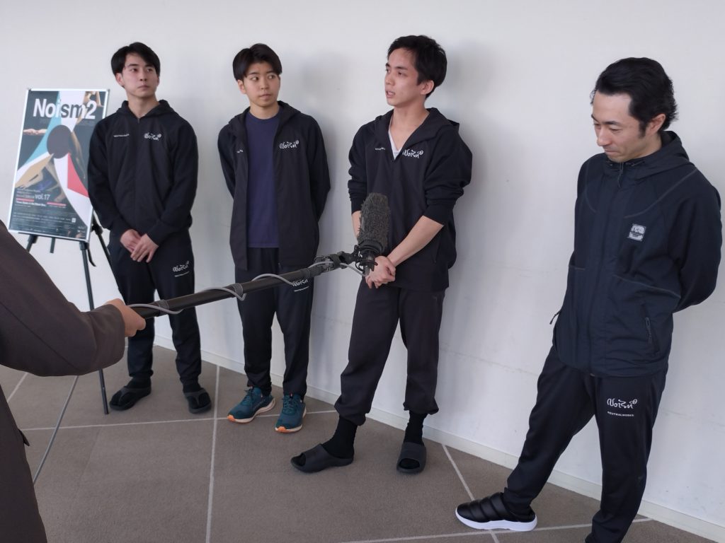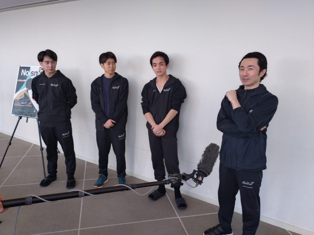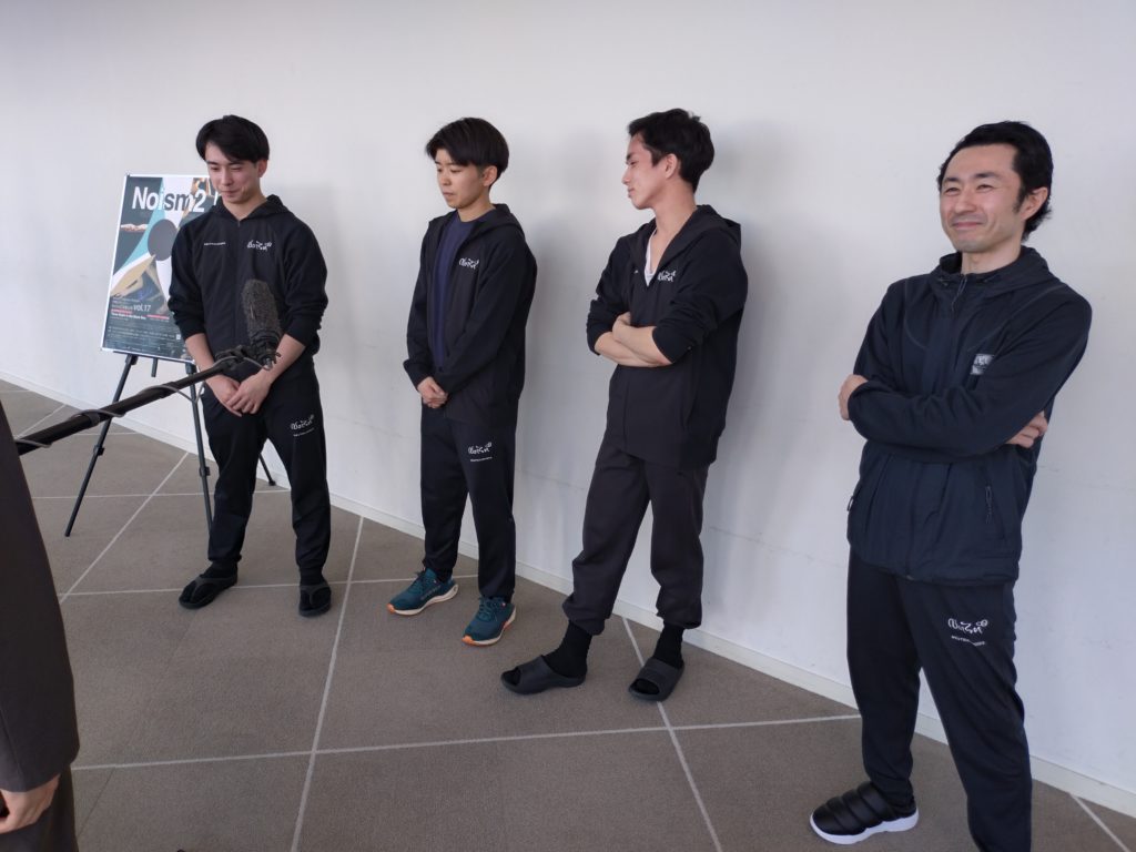 その後、場所をホワイエに移して行われた「囲み取材」に立ったのは、Noism地域活動部門芸術監督の山田勇気さんと、中尾さん、坪田さん、そして樋浦さんの4人。そこでのやりとりからご紹介を試みます。