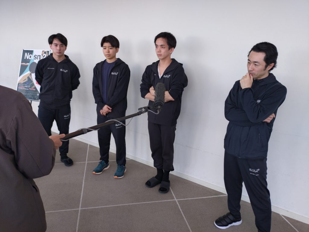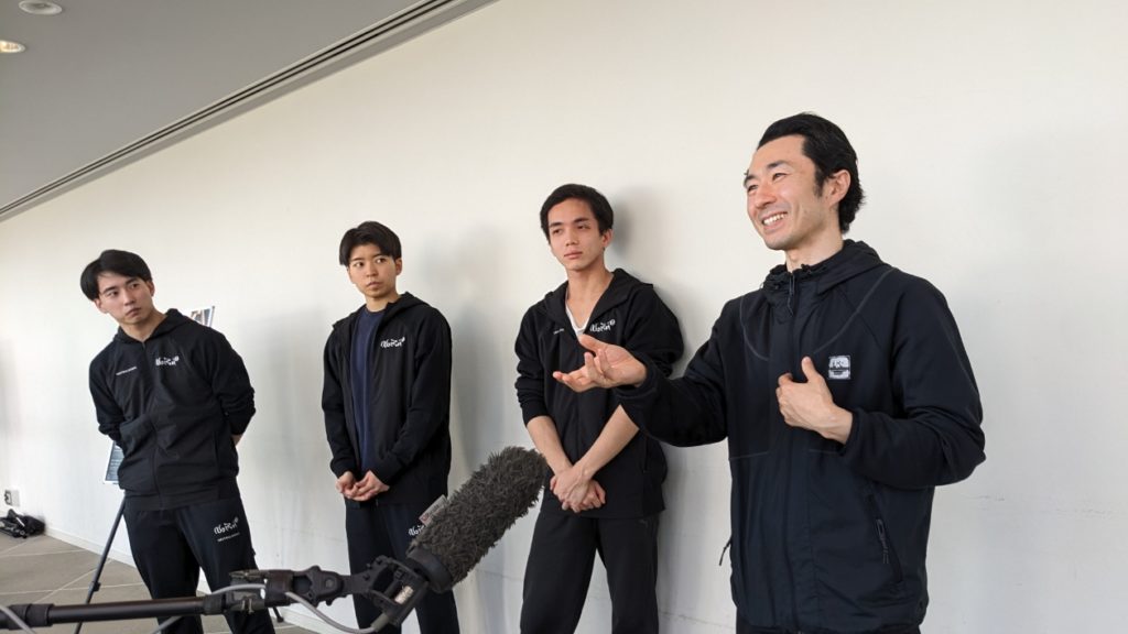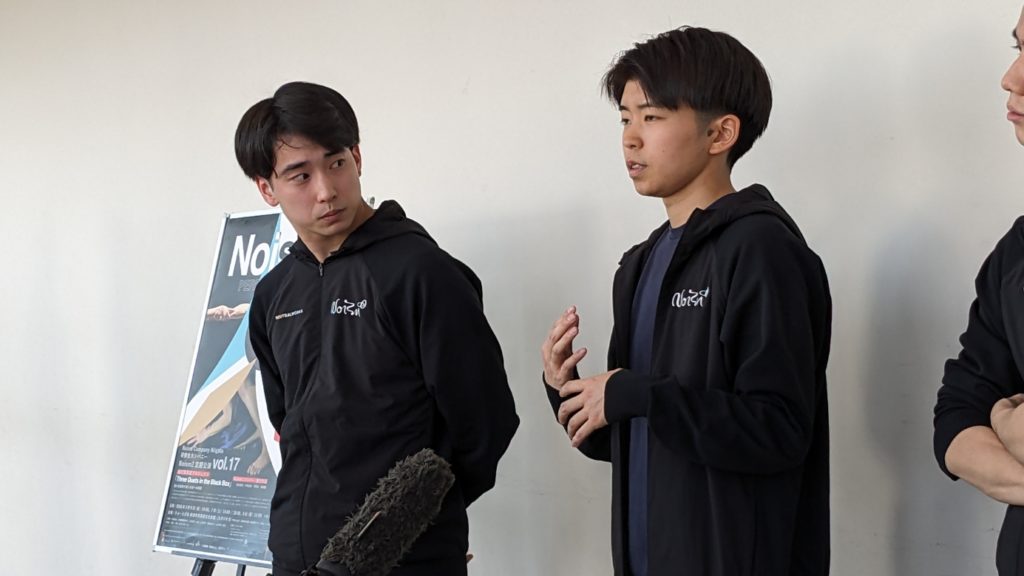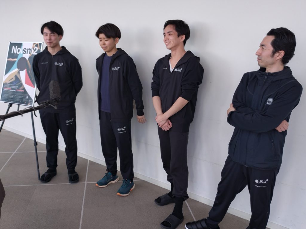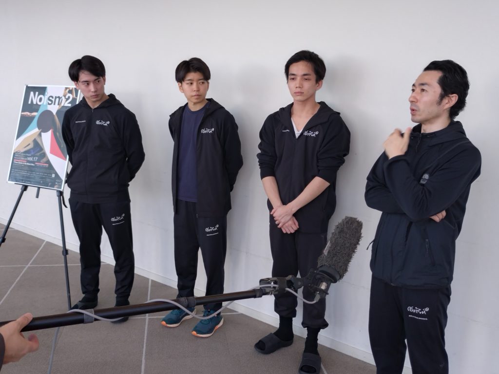 その後、場所をホワイエに移して行われた「囲み取材」に立ったのは、Noism地域活動部門芸術監督の山田勇気さんと、中尾さん、坪田さん、そして樋浦さんの4人。そこでのやりとりからご紹介を試みます。