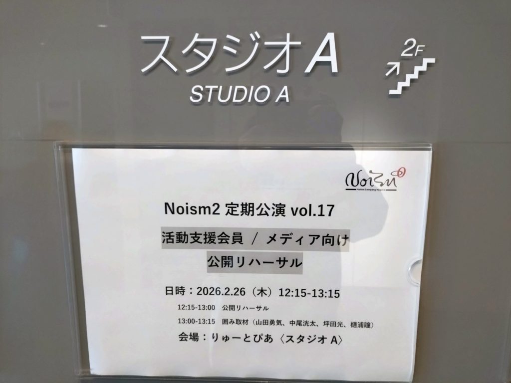 2026年2月26日(木)、上着を着る必要もないようなお昼どき、りゅーとぴあ〈スタジオA〉を会場に開催された「Noism2定期公演vol.17」活動支援会員/メディア向け公開リハーサル及びその後の囲み取材に参加してきました。