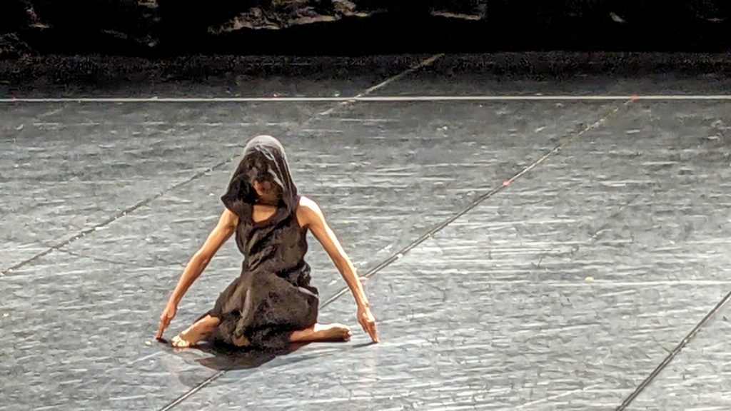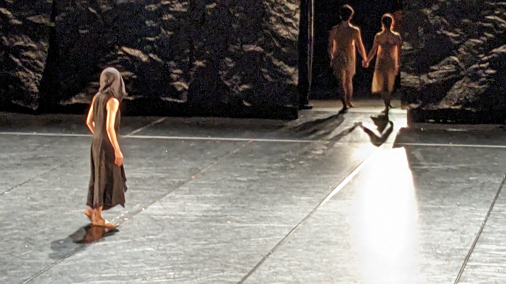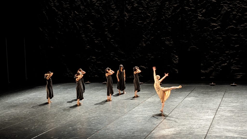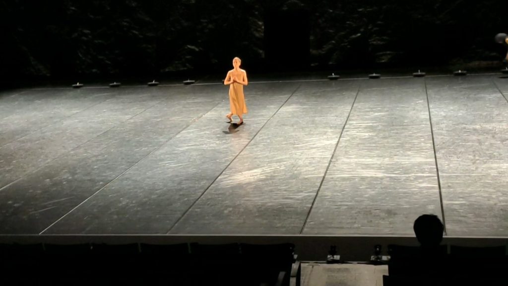 12:20、金森さんの「いきましょうか」の言葉に、客電が落ち、場内全体を薄暗さが覆ったかと思うと、アルヴォ・ペルトの音楽が流れ出し、舞台上の井関さんと6人の「レディース」が踊り始め、後半部分の通し稽古が始まりました。