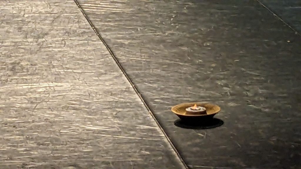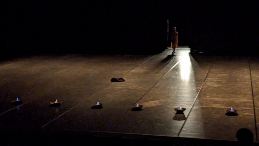 〈劇場〉の客席に腰をおろしますと、舞台奥にはゴツゴツした武骨な壁面とそこに穿たれた通路とおぼしき「開口部」、そして舞台上のそこここに10数個配置された炎がゆらめく「火皿(ひざら)」が目に飛び込んできます。(舞台装置はまだ完成していないとのことでしたが、)全体的な暗さも相俟って、何やら怪しい儀式性を発散させる空間に映ります。