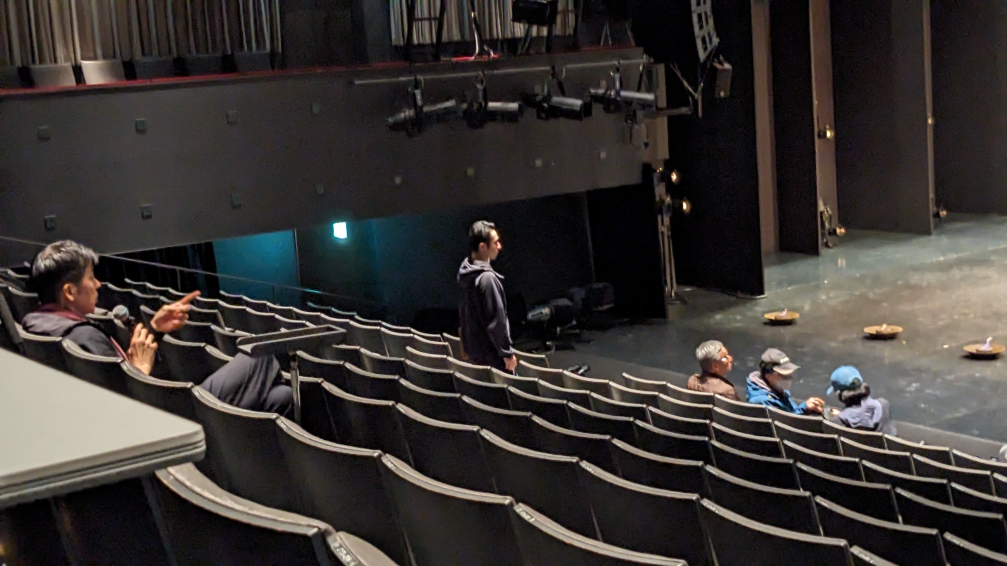 なかでも、この日、最も時間が割かれたのは「火皿」を置く位置の再検討でした。で、そこを動かし始めると、変更は様々な動きや動線にまで及んでいくことになります。色々と試し得る限り試してみる金森さんが発した「大丈夫。まだ照明は作っていないから」は果たして慰めになっているのか、いないのか。思わず笑いが零れる舞台上のメンバー、そして客席の私たち。そこには、常に妥協を知らず、本番ギリギリまで(否、本番の幕があがってさえなお)ベストを追い求めて止まない金森さんの姿がありました。